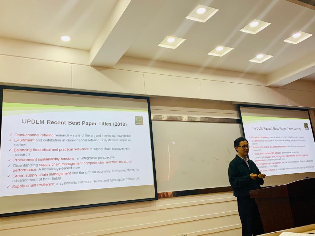 ,是物流与供应链领域的国际知名学者,担任2本SSCI期刊亚洲区编审,他毫无保留地向大家分享了自己从“菜鸟”到“爆发”的研究经历。他首先向大家介绍了他的求学和工作经历、主要研究方向,然后重点介绍了物流与供应链领域SSCI/SCI国际期刊的情况,包括主要期刊名称、主办单位、收录论文的数量与偏好、投稿周期、审稿标准以及有助于发表的技巧和注意事项,最后苏雄义教授向师生们分享了自己的科研项目——全联实业转型案例,该项目主要通过crossdocking为全联便利店重新设计配送系统。