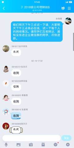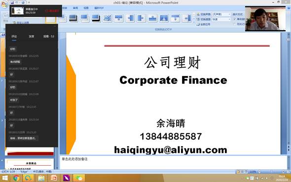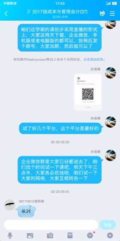 在开学的前两周几位老师就开始了教学的准备工作,在确定教学方式的系内小型网络会议上,余海晴老师就说“没关系,我的两门课都可以进行直播”,虽然直播教学需要学习准备的工作很多,但余老师却十分“轻松”的承担下来两门课《公司理财》、《成本与管理会计》的直播教学工作。在上课前期就已经通过QQ群迅速与学生们建立了高效的信息交流,发布课程和进行试课准备。同时,通过教学软件的对比选择,余海晴老师选择了网络更为流畅和功能全面的企业微信软件进行直播,并结合超星上传课程PPT等资料进行辅助教学。