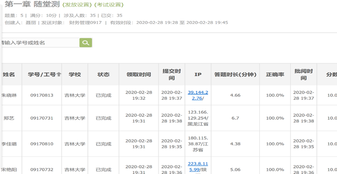 为了考察学生听课质量,聂丽老师还就本周主要基础知识进行了限时测试,同学们积极作答,90%以上的学生拿到了满分。此外,通过学习通可以了解学生的答题时间、排名等信息,短时间内迅速完成课程测试,这是传统教育方式所无法实现的。同时,在课程直播结束后,以作业的形式发起讨论,学生积极参与,纷纷结合本周学习内容发表自己的理解和看法。