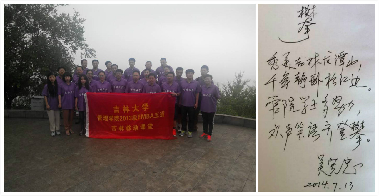 第二天,我们踏上吉林之旅的第二站——徒步龙潭山、同游松花湖。来到美丽的江城,怎能错过这青山绿水。一句“一座龙潭山,半部东北史”道出龙潭山的魅力。龙潭山公园位于吉林市东部,松花江东岸,因山上有龙潭古池而得名,是一个以森林为主要参观的公园。于班长为了让同学们更好的了解吉林市的历史,特地请来了当地最有名的电台主持人——林欢与我们共游龙潭山、松花湖。林欢对东北历史文化深厚的底蕴,每到一个景点都能如数家珍、娓娓道来,这让我们这一路的参观更是锦上添花,最后由吴宪忠老师代全体2013级EMBA学员赋诗一首以表谢意。