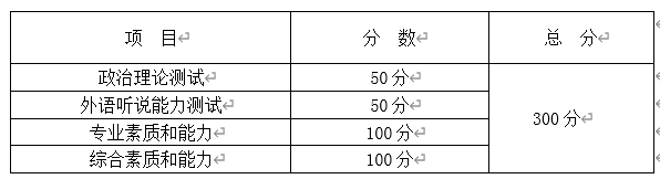 主考教师由精通外语的教师担任。内容为:考生外语自我介绍,从外语题库随机抽取试题,回答主考教师提出的问题。